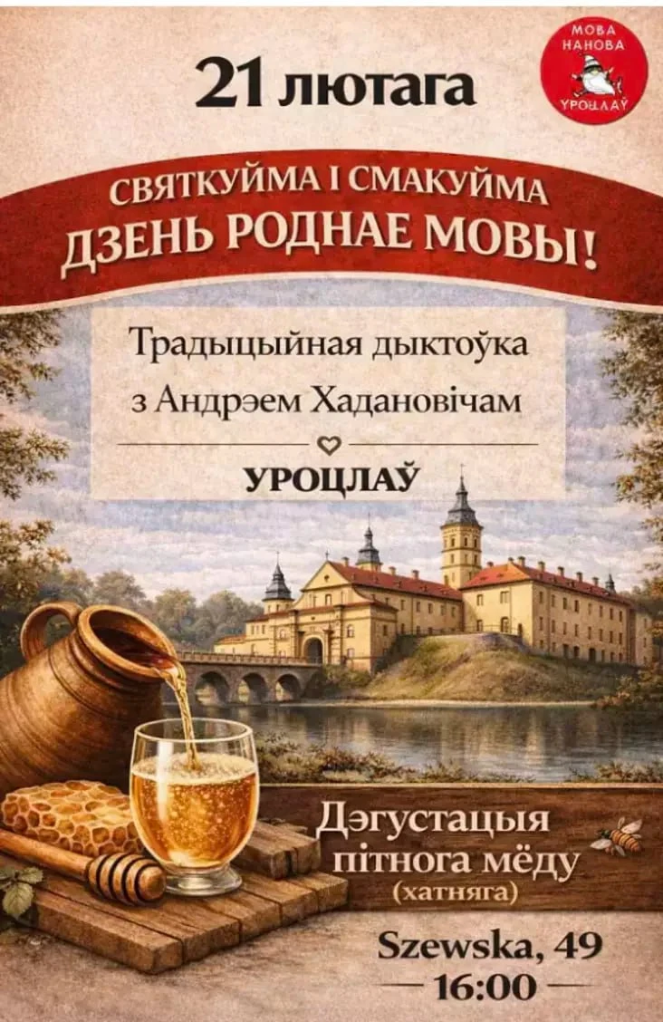 Ва Уроцлаве адбудзецца сустрэча «Мовы нанова» да Дня роднай мовы. Сёлета дыктоўку правядзе Андрэй Хадановіч, паэт, перакладчык, літаратуразнаўца і выкладчык. Пітны мёд — таксама беларуская традыцыя! Таму далей святкаванне адбудзецца ў дэгустацыйным фармаце.