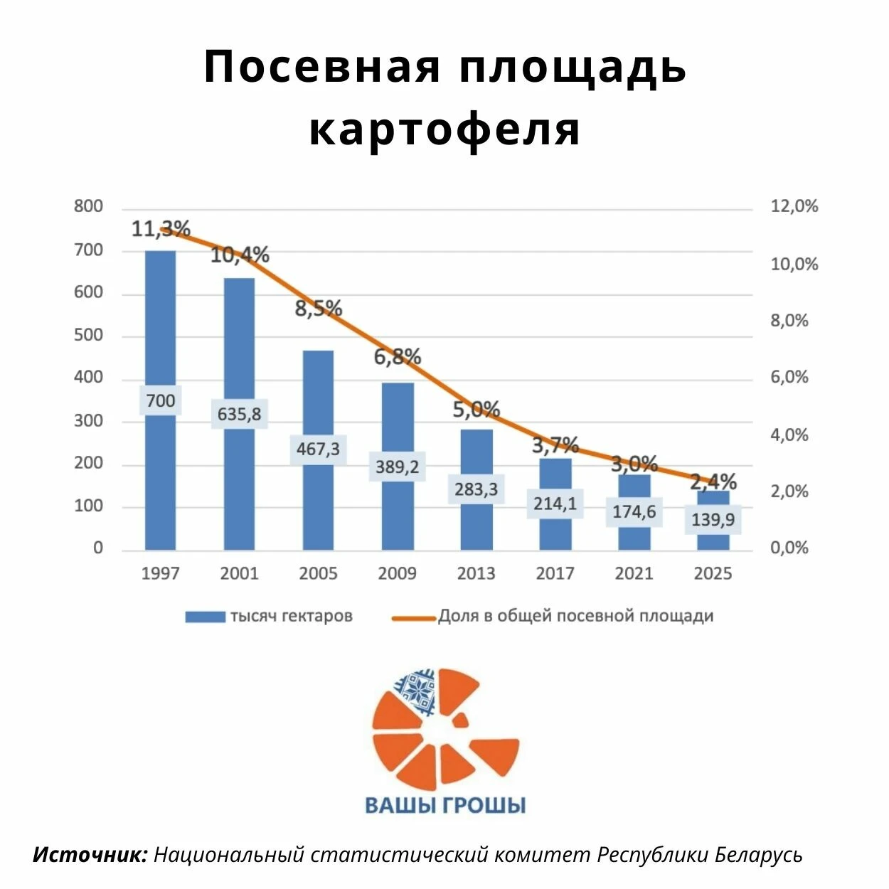 По данным Белстата, посевные площади под картофель за последние десятилетия сжались почти драматически: если в конце 1990-х под него отводили около 700 тыс. гектаров, то к 2025 году — уже 139,9 тыс. гектаров, то есть примерно в пять раз меньше.