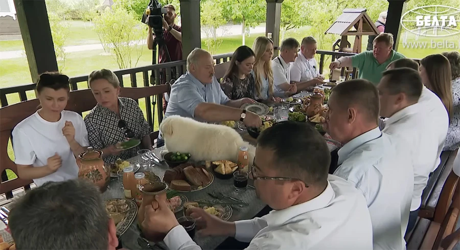 А в июне 2022-го делать вид, что собака, сидящая хвостом в тарелке с хлебом — это нормально, пришлось высокопоставленным чиновникам и ученым-аграриям, обедавшим в гостях у Лукашенко в Александрии.